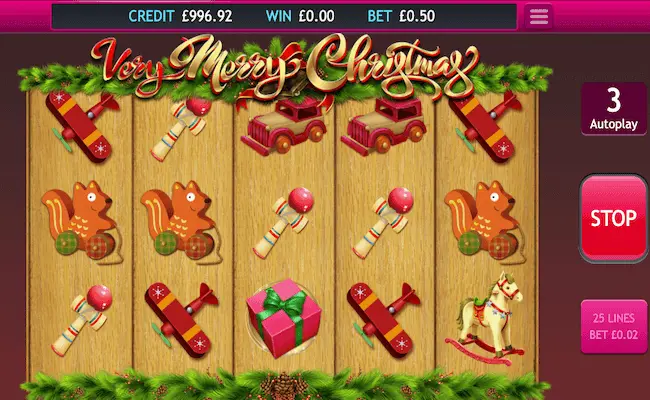 Very Merry Christmas is set on a 5-reel, 3-row layout, and it has 25 paylines that you can activate during gameplay. You’ll notice that the Christmas theme is central to the slot’s design. From the colourful presents to the glistening globes that make you feel like you’re in Santa’s workshop. This joyful vibe adds to the gameplay, making it both visually fun and highly engaging.
